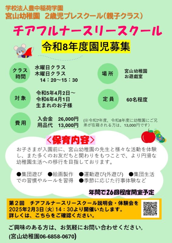 令和8年度チアフルナースリースクール第2回説明会及び体験会のお知らせ 2025/12/16(更新日: 2025/12/16) お知らせ 令和5年4月2日~令和6年4月1日生まれのお子様を対象としております。 詳しくは、こちらをご確認ください。 << 前の記事へ 最近の投稿 給食の食品衛生管理 日常 令和8年度チアフルナースリースクール第2回説明会及び体験会のお知らせ 令和7年度 第5回園庭開放のお知らせ 令和7年度 第4回幼稚園開放のお知らせ カテゴリー 未分類 お知らせ ブログ